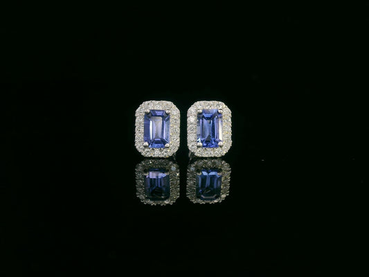 18K White Gold Emerald-cut Tanzanite & Diamond Halo Stud Earrings