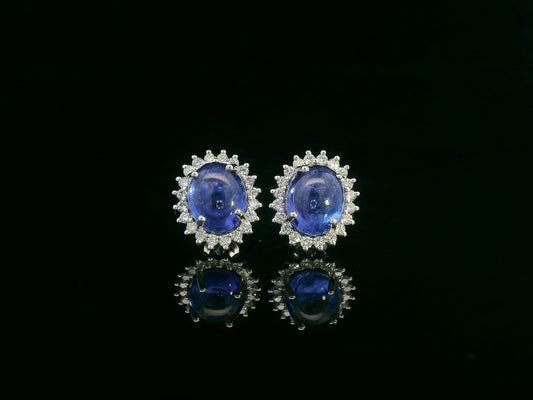 18K Gold Cabochon OvalTanzanite Earrings with Sunburst Diamond Halos