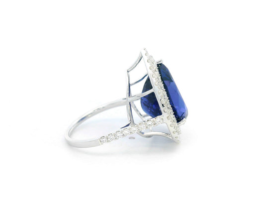 18K Gold Pear-Shaped Tanzanite Cocktail Ring with Double Diamond Halo – 13.07 Carat Center Stone