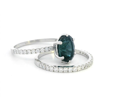 18K Gold Blue Sapphire Bridal Set – 3.21ct Oval Sapphire with 0.59ct Diamonds on the bands.