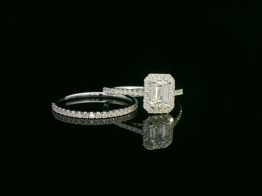 18K White Gold Emerald-Cut Diamond Bridal Set with Halo – 1.00ct Center,