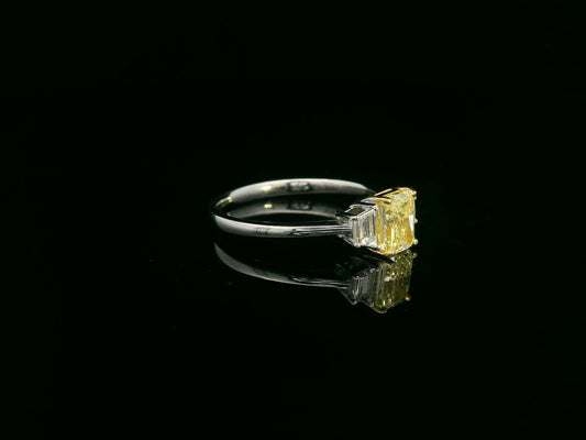 18K White Gold Radiant Cut Fancy Yellow Diamond Ring – 1.00ct Center with Trapezoid Side Diamonds