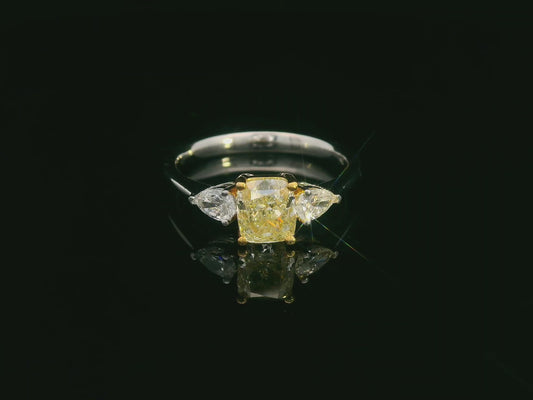 18k White Gold Cushion-Cut Fancy Yellow Diamond Ring with Pear Diamonds | IGI Certified
