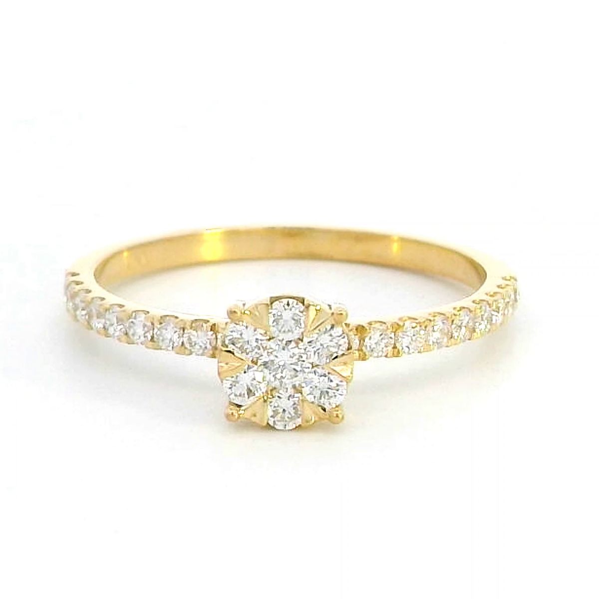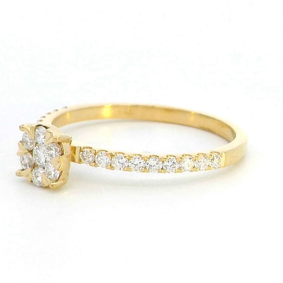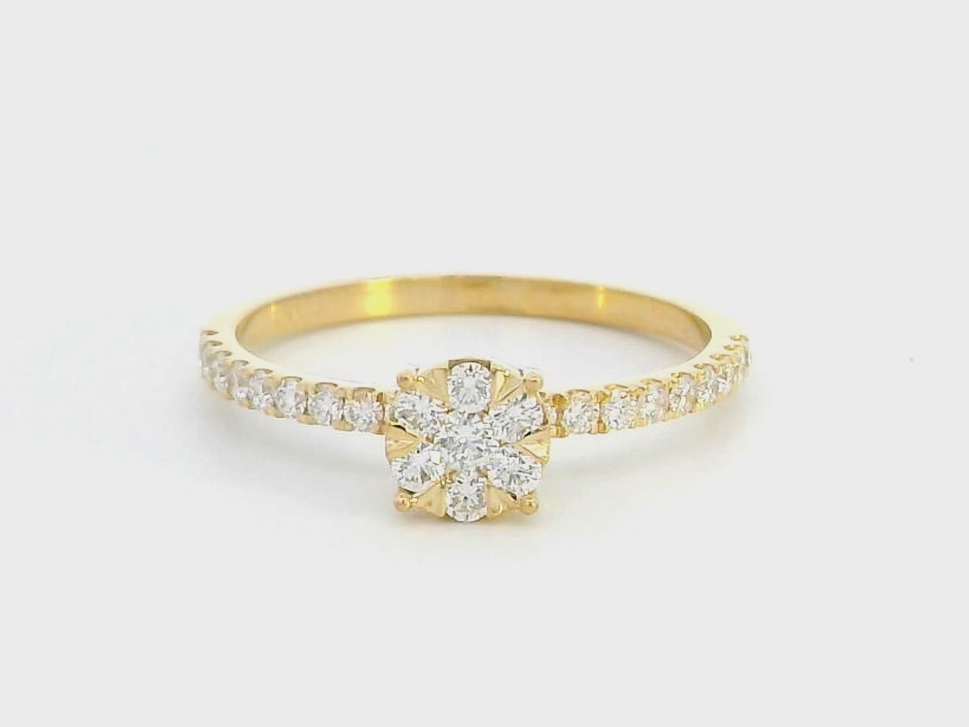 This stunning 18K gold ring features a brilliant diamond cluster at the center, with a band accented by additional round-cut diamonds for extra sparkle. With a total diamond weight of 0.46 carats, the carefully set diamonds enhance the beauty of the cluster without overwhelming it, creating an elegant yet eye-catching design. The ring offers both sophistication and versatility, perfect for everyday wear or special occasions. Comes beautifully packaged in a luxury gift box, making it a perfect gift for loved ones.