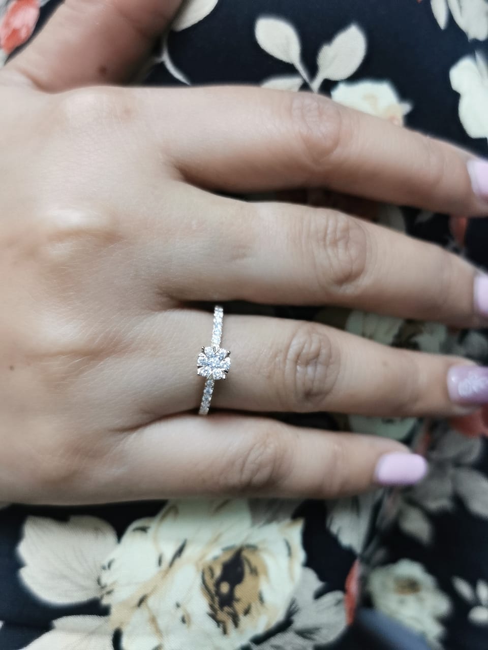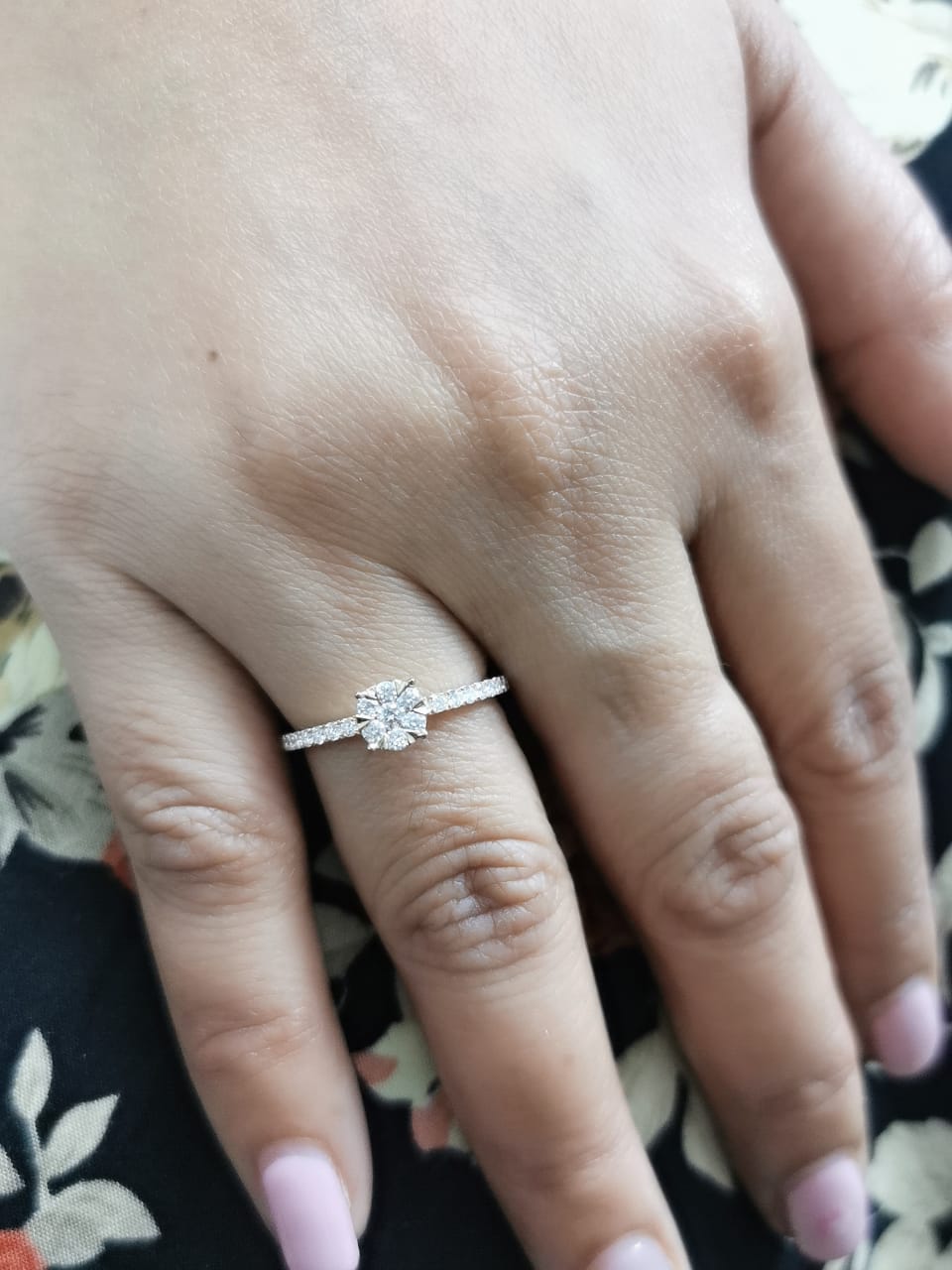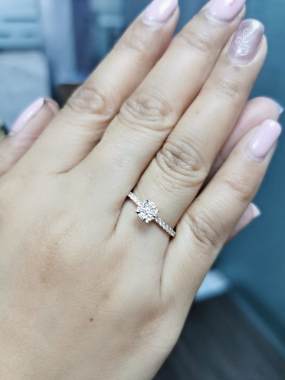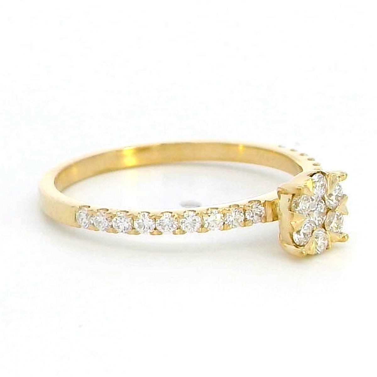This stunning 18K gold ring features a brilliant diamond cluster at the center, with a band accented by additional round-cut diamonds for extra sparkle. With a total diamond weight of 0.46 carats, the carefully set diamonds enhance the beauty of the cluster without overwhelming it, creating an elegant yet eye-catching design. The ring offers both sophistication and versatility, perfect for everyday wear or special occasions. Comes beautifully packaged in a luxury gift box, making it a perfect gift for loved ones.