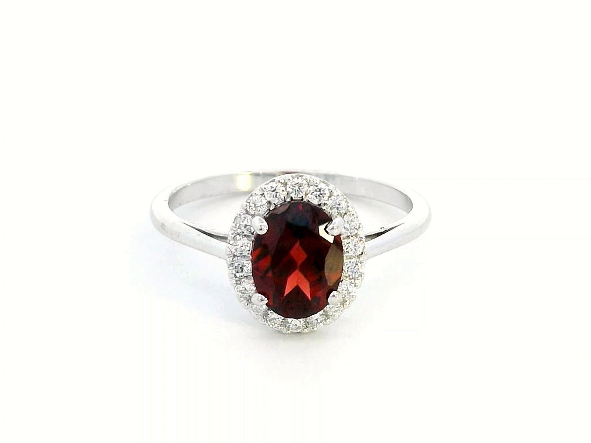 18K Gold Garnet with Diamond Halo Ring | 1.58 Carat Oval Garnet with 0.21 Carat Diamond Accents
