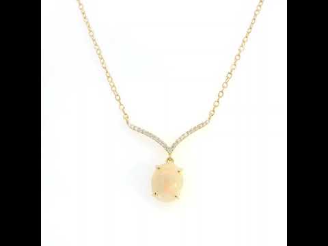 - Design: V-shaped diamond-accented pendant with an opal centerpiece