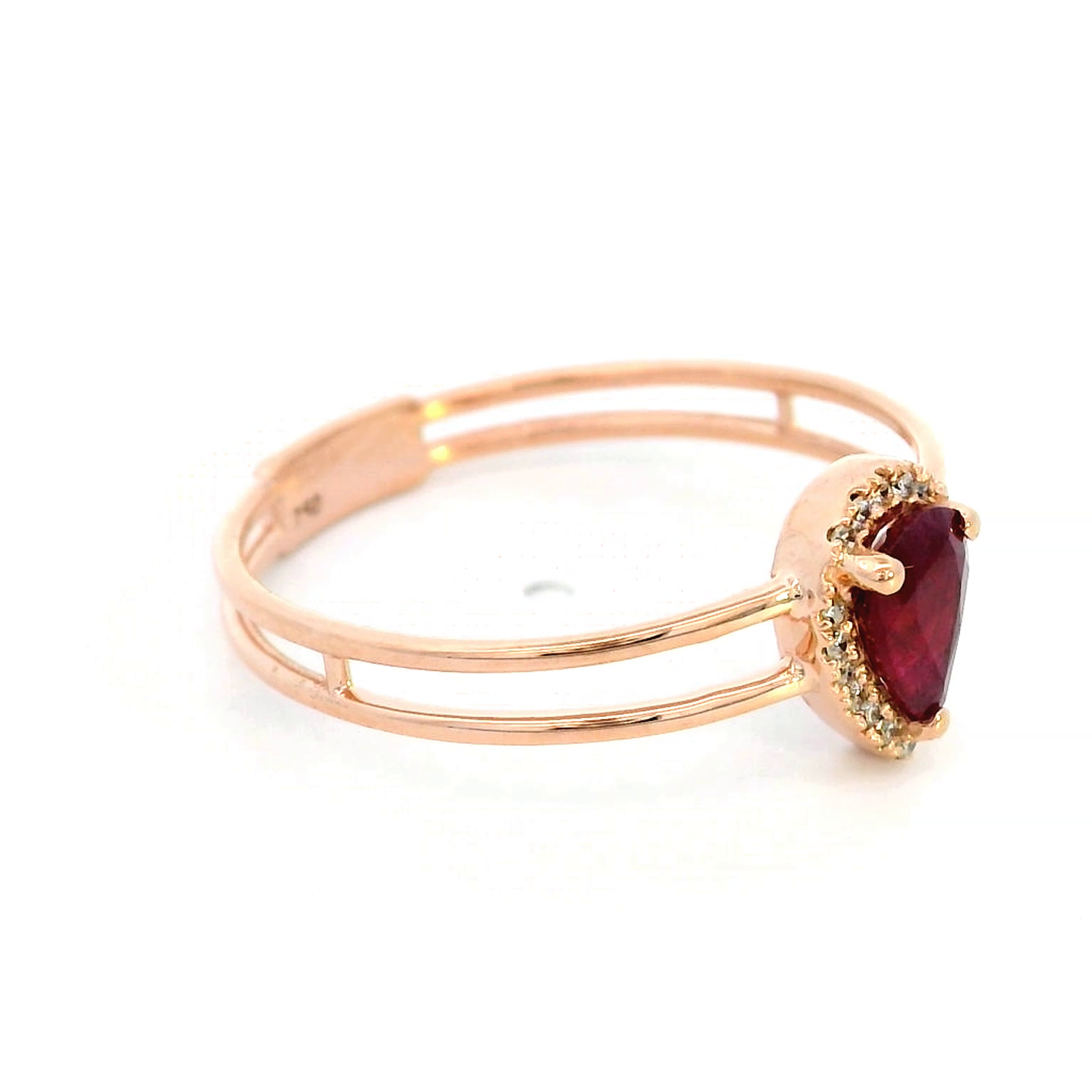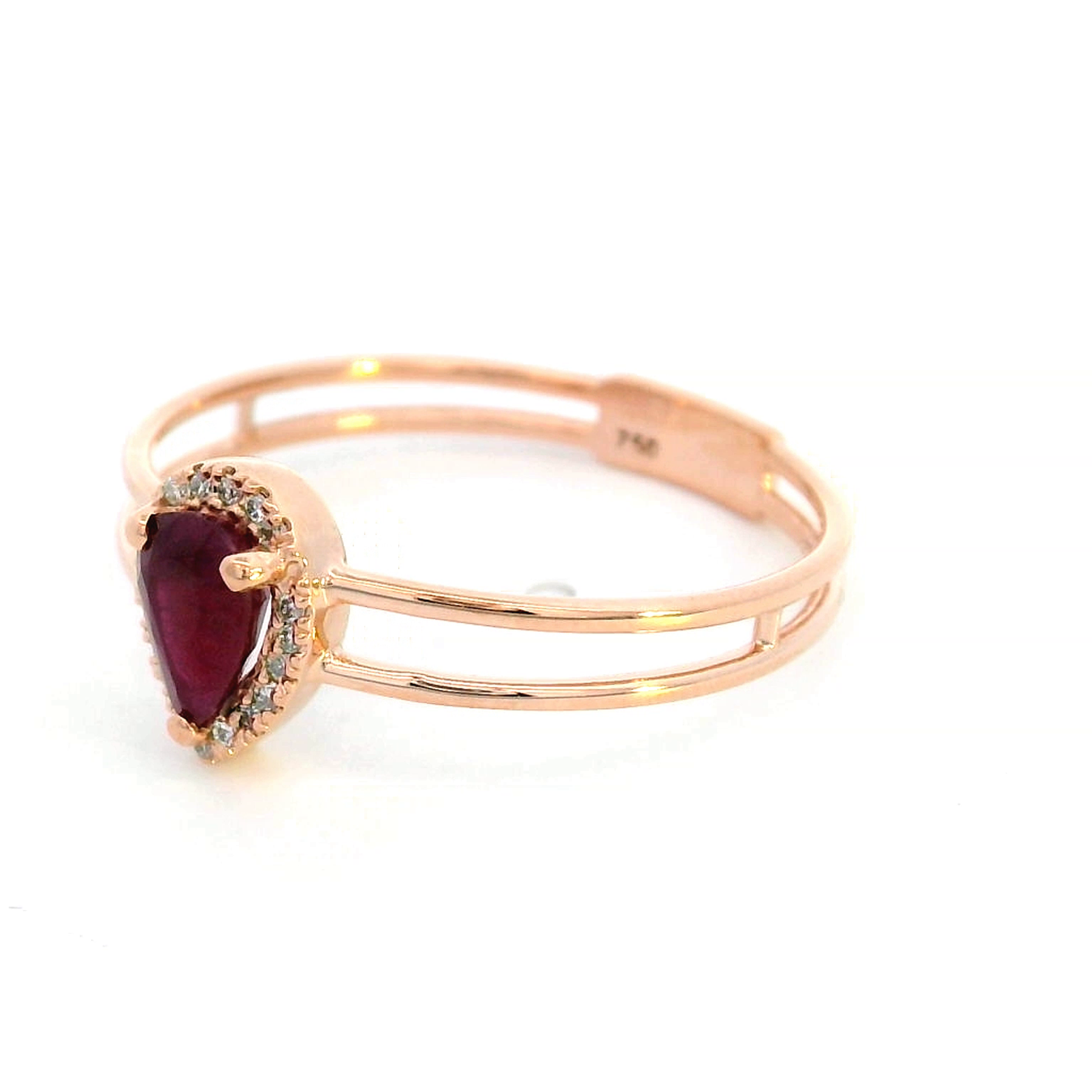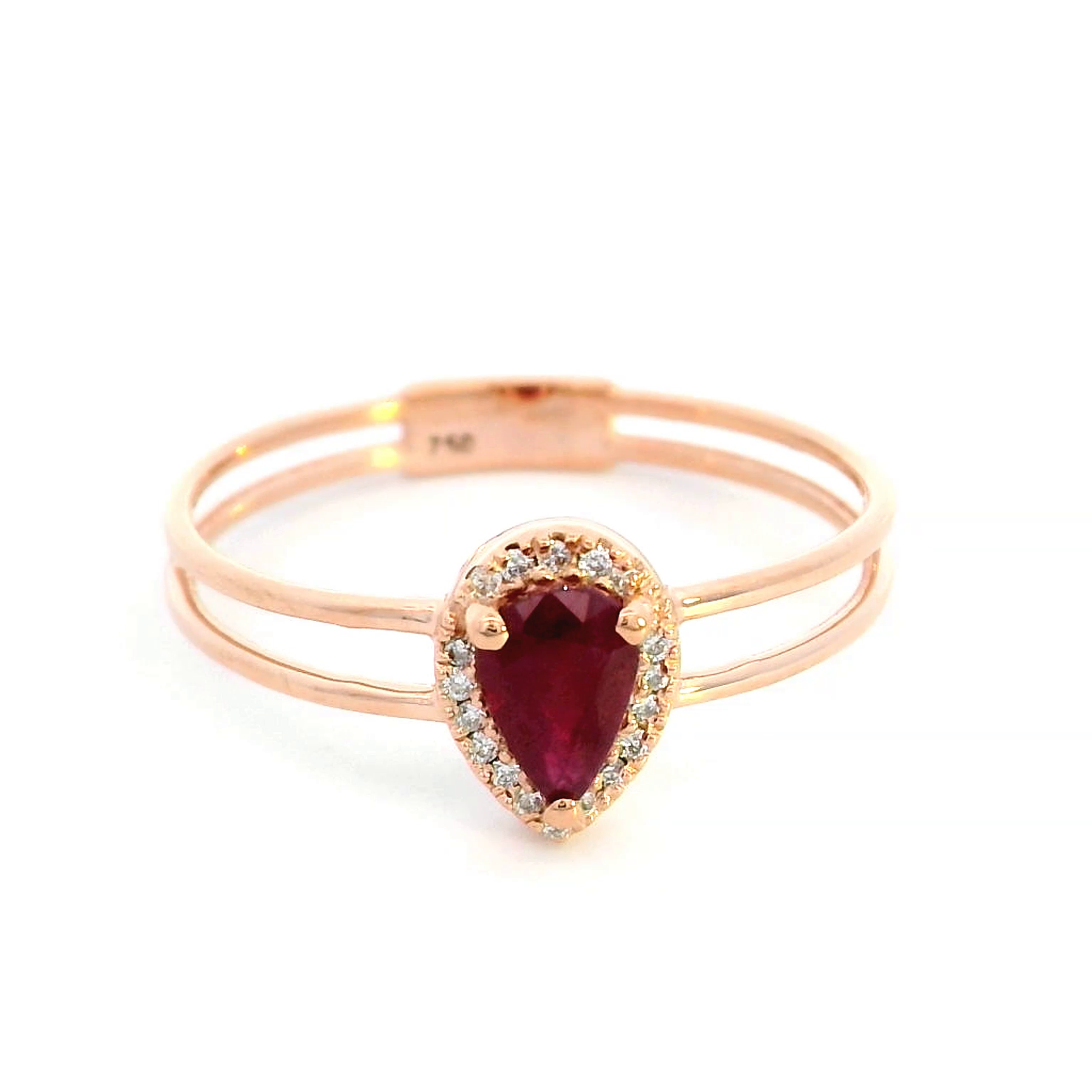 Make a statement with this 18K rose gold pear-shaped ruby ring, featuring a 0.53-carat natural ruby in a dazzling diamond halo setting. The 0.05-carat round diamonds enhance the brilliance of the rich red ruby, creating a luxurious and timeless design. Crafted in elegant 18K rose gold, this ruby and diamond ring is perfect for engagements, anniversaries, gifts, or everyday elegance. A breathtaking addition to any jewelry collection.