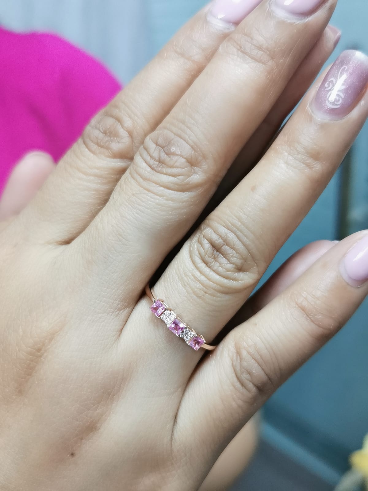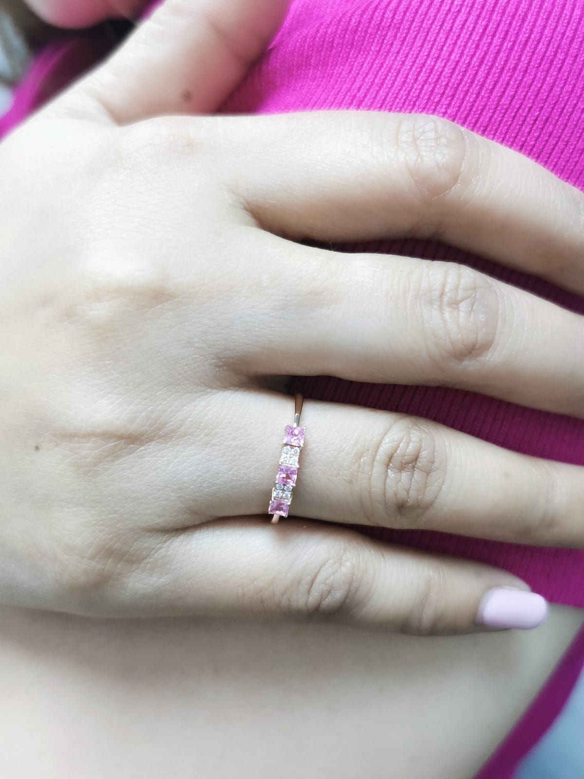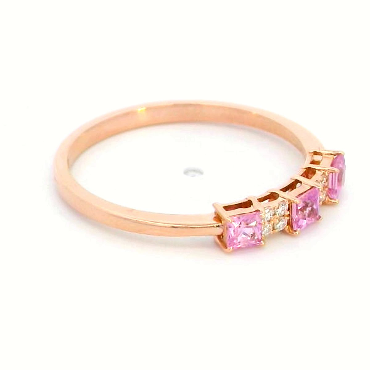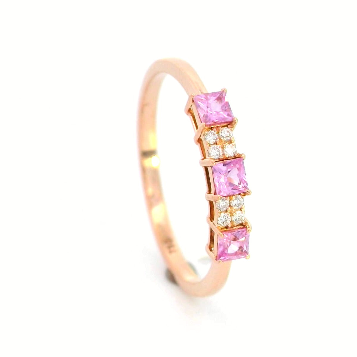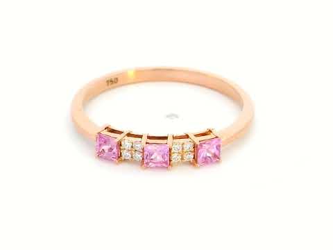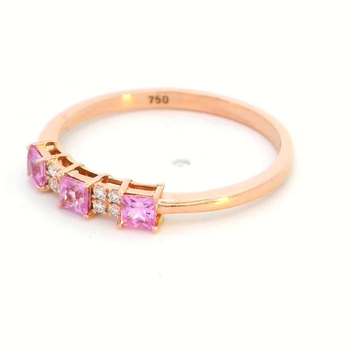 Elevate your jewelry collection with this elegant 18K rose gold stacking ring, featuring three princess-cut pink sapphires totaling 0.40 carats, complemented by 0.05 carats of sparkling diamonds. Designed for versatility, this ring can be worn alone for a minimalist statement or stacked with other rings for a trendy layered look. Perfect for daily wear or special occasions, this ring combines vibrancy, luxury, and modern design in one stunning piece.