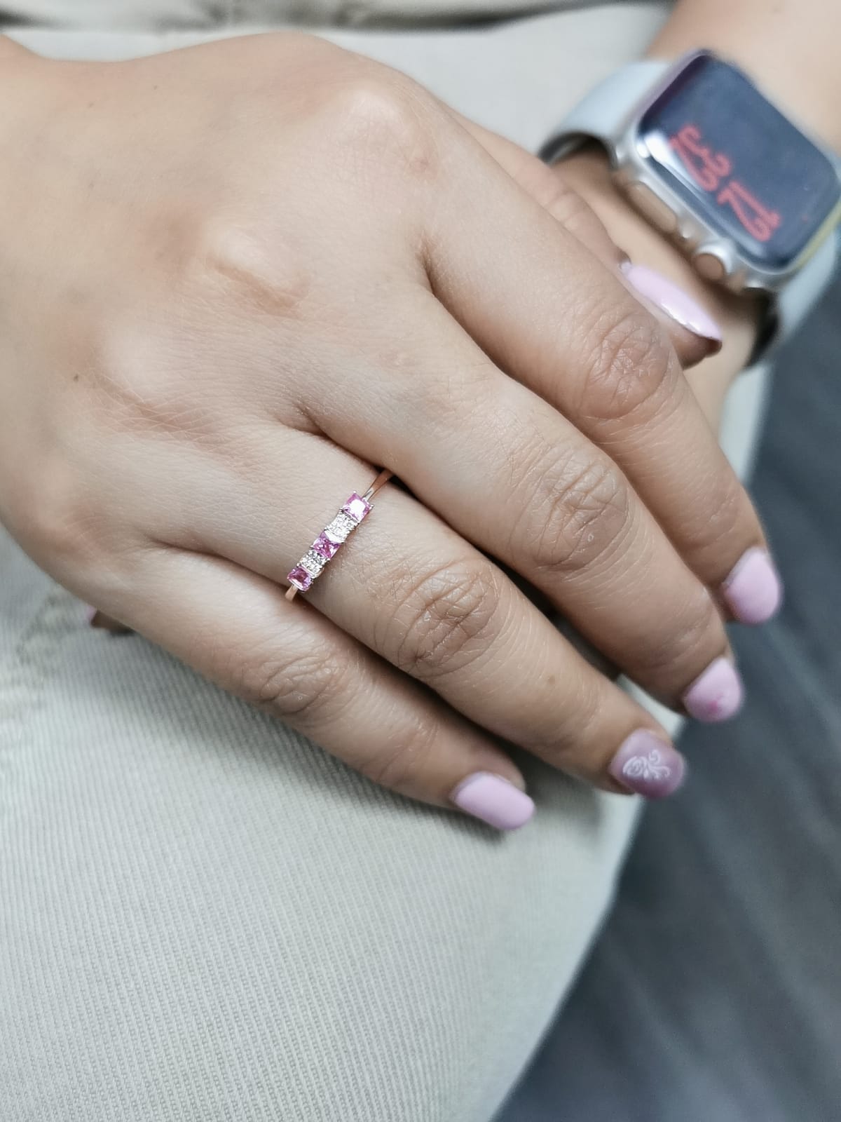 Gemstones: Features three princess-cut pink sapphires with a total weight of 0.40 carats.