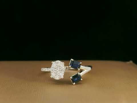 Elegant and contemporary, this 18K white gold open-cuff ring redefines modern sophistication. One side features a radiant cluster of diamonds, while the other is adorned with two striking emerald-cut blue sapphires. Together, they create a captivating interplay of light and color.