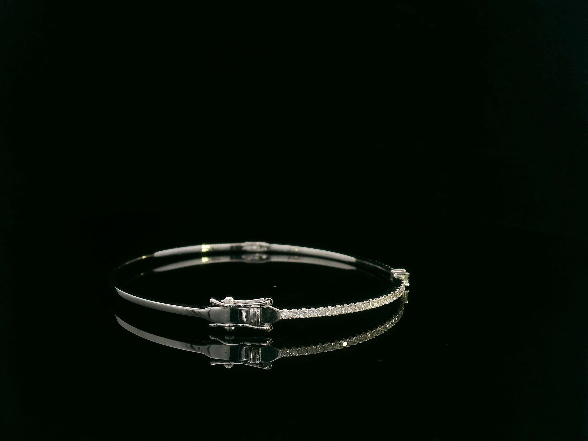 A refined balance of subtlety and sophistication, this diamond bangle combines the brilliance of round-cut diamonds with the modern appeal of a horizontally set baguette accent. Perfect for stacking, special occasions, or as a signature everyday piece, it embodies elegance and contemporary luxury.