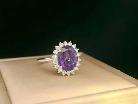 18K White Gold Oval Amethyst Ring with Sunburst Diamond Halo