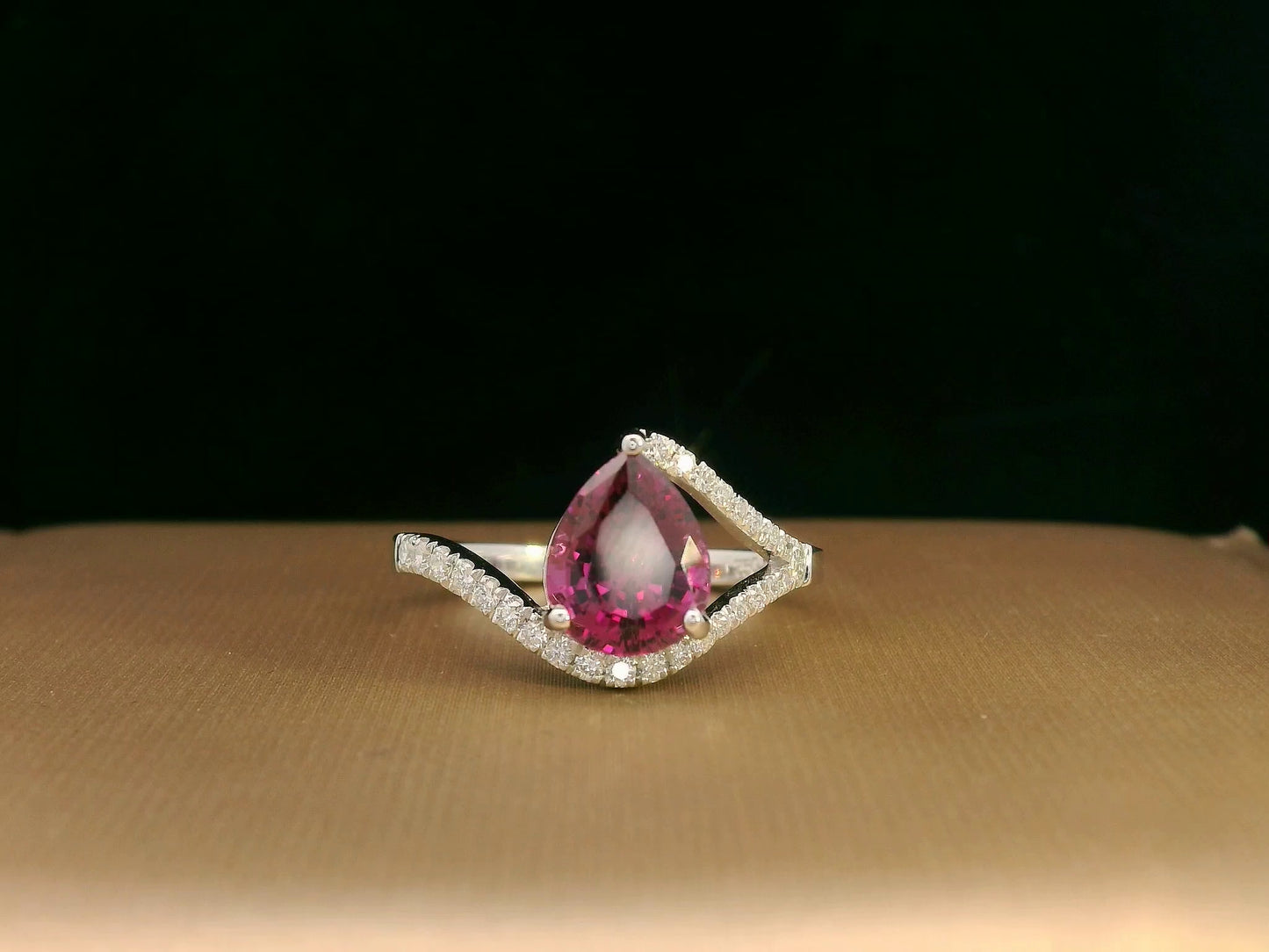 18K White Gold, Pear Shape Rhodolite Garnet and Diamond Ring