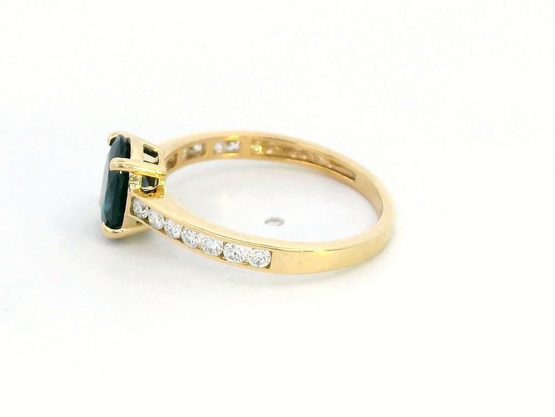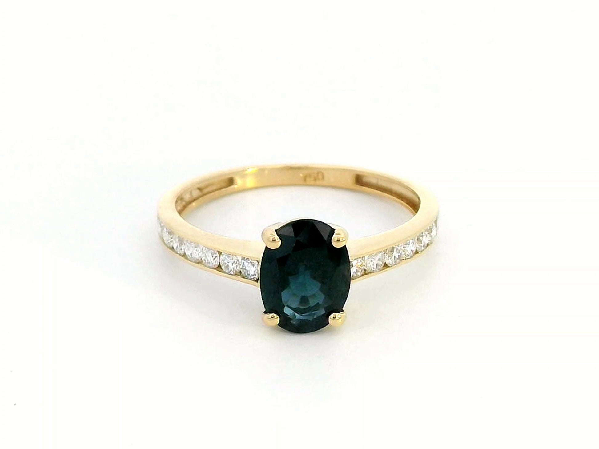 Elevate your style with this exquisite 18K yellow gold ring, featuring a stunning 1.41-carat oval-shaped sapphire as its centerpiece. The band is adorned with channel-set diamonds totaling 0.28 carats, creating a harmonious blend of brilliance and color. Designed to embody timeless elegance, this ring is perfect for special occasions or as an heirloom-worthy piece. Celebrate the charm of vintage-inspired jewelry with this unique creation, crafted with exceptional artistry.