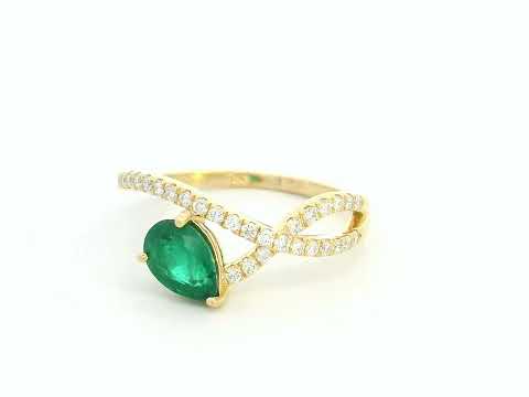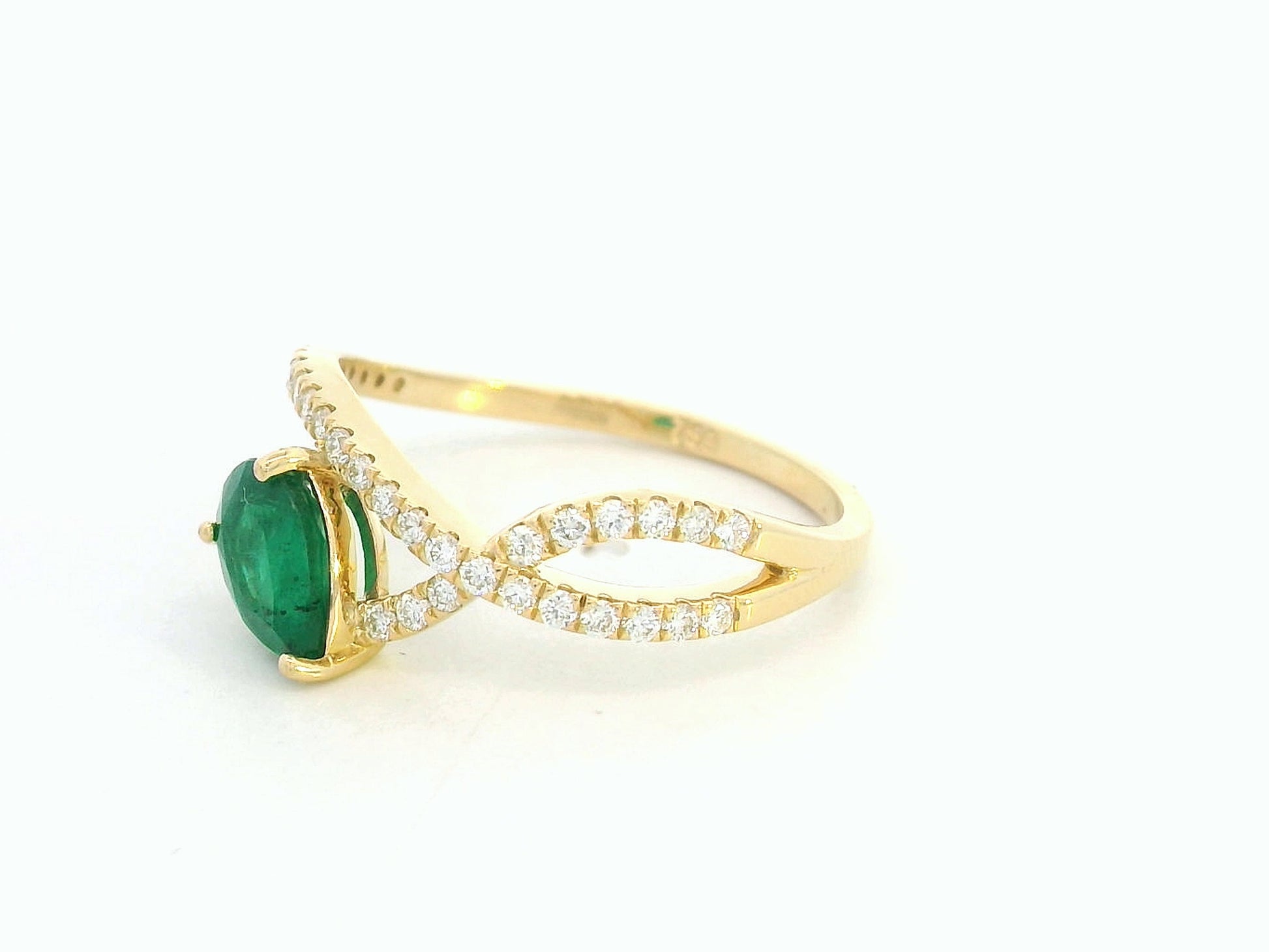 This elegant 18K yellow gold ring features a graceful crossover-style band, adorned with a row of sparkling round diamonds that twist beautifully around the finger. At its center, a vivid pear-cut emerald is securely held in a three-prong setting, its vibrant green hue contrasting elegantly with the warm gold and brilliant diamonds. The flowing asymmetrical design evokes movement and sophistication, creating a timeless piece that radiates refinement. Perfect for both everyday elegance and special occasions, this ring celebrates harmony, beauty, and lasting luxury.