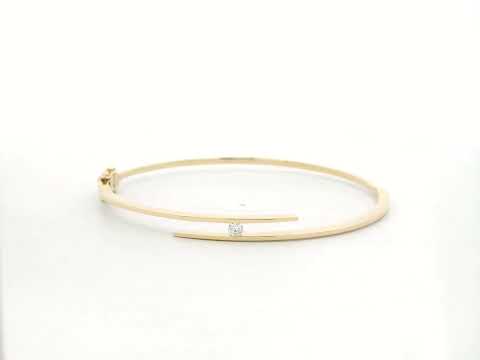 Sleek, architectural, and refined, this diamond open bangle is crafted in radiant 18K yellow gold and designed with a single 0.10 carat diamond, tension-set between the two polished gold ends, creating the illusion of the diamond suspended effortlessly in place.