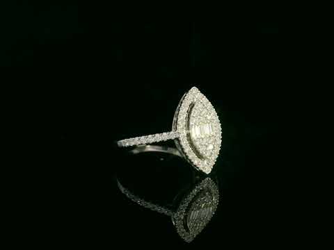 A striking blend of modern artistry and timeless elegance, this marquise-inspired diamond ring commands attention with its sculptural silhouette. Crafted in luminous 18K white gold, the design centers on an elongated marquise motif set with baguette-cut diamonds framed a shimmering halo of brilliant-cut diamonds. The delicate pavé band adds an extra touch of radiance, creating a piece that feels refined, feminine, and undeniably luxurious.