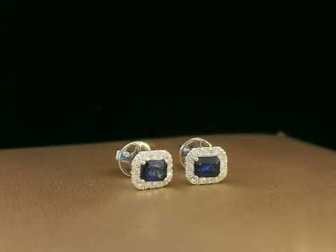Delicate, refined, and effortlessly elegant, these 18K white gold stud earrings feature emerald-cut blue sapphires framed by a shimmering halo of round brilliant diamonds. Handcrafted to perfection, they capture the timeless appeal of sapphires while adding a modern minimalist edge.