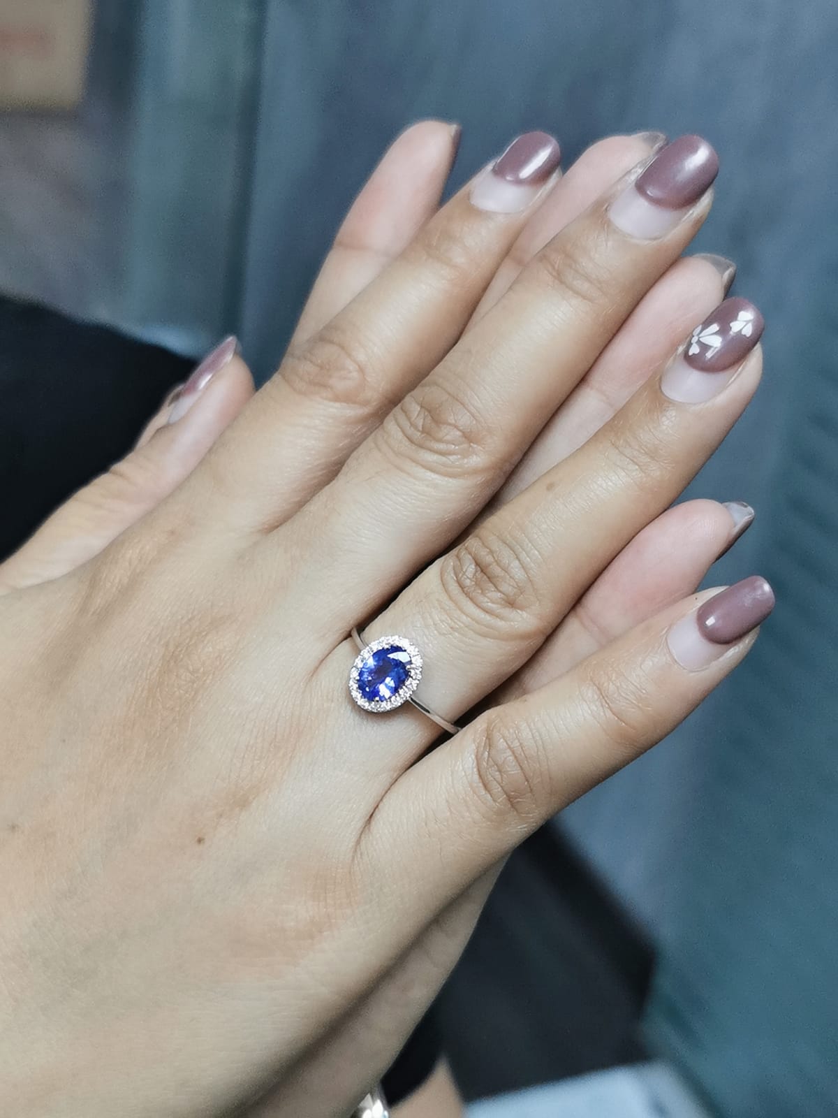 Ethereal Elegance: Oval-Cut Tanzanite and Diamond Halo Ring In 18k Gold.
