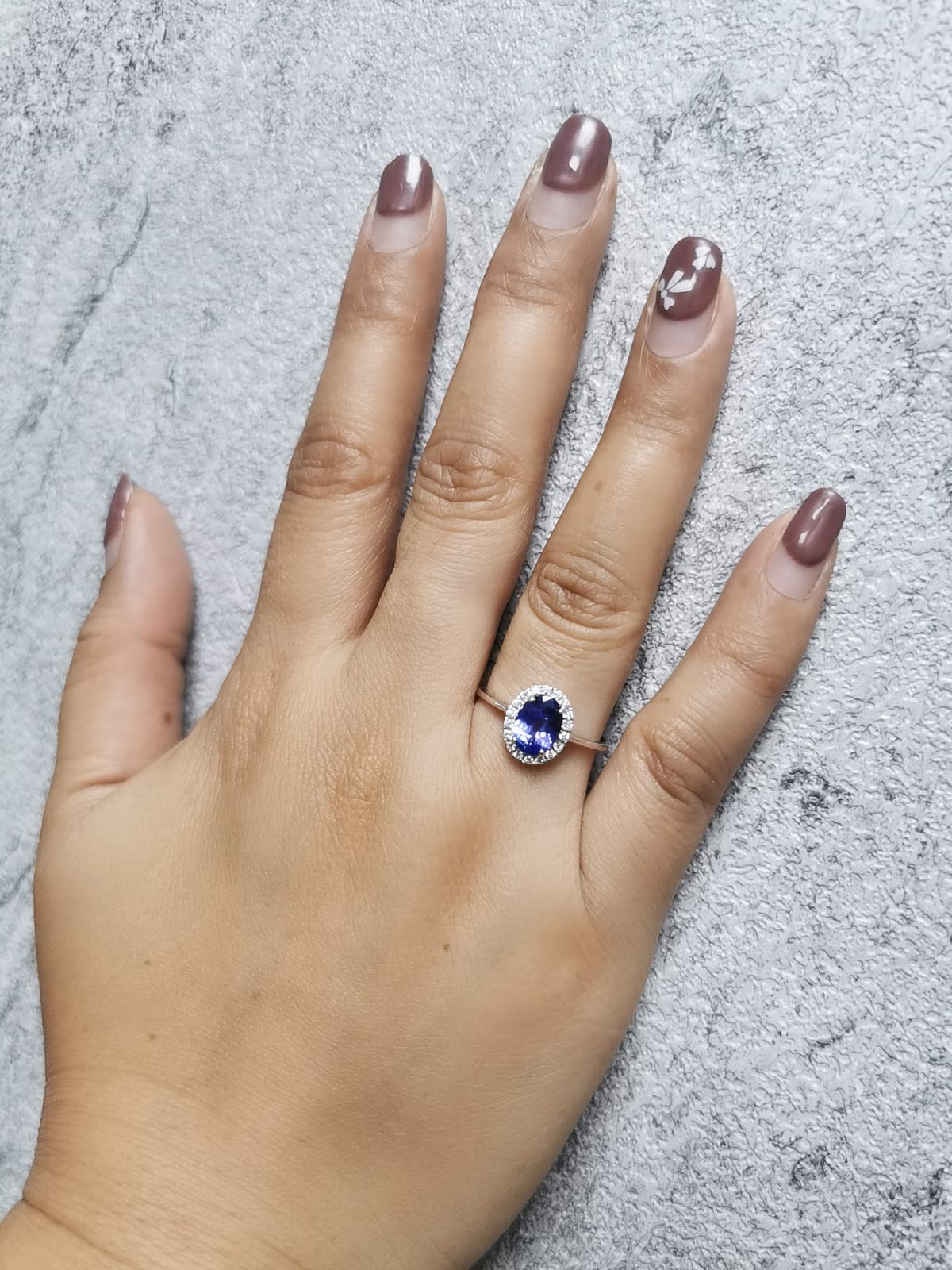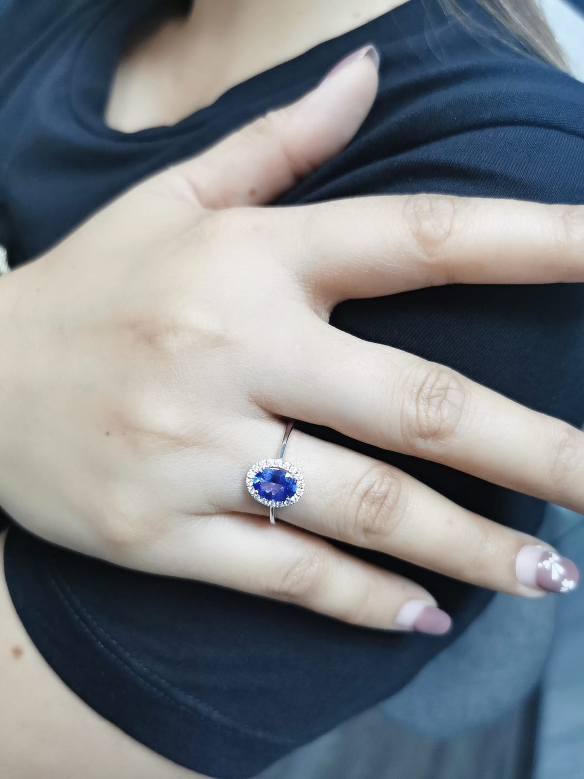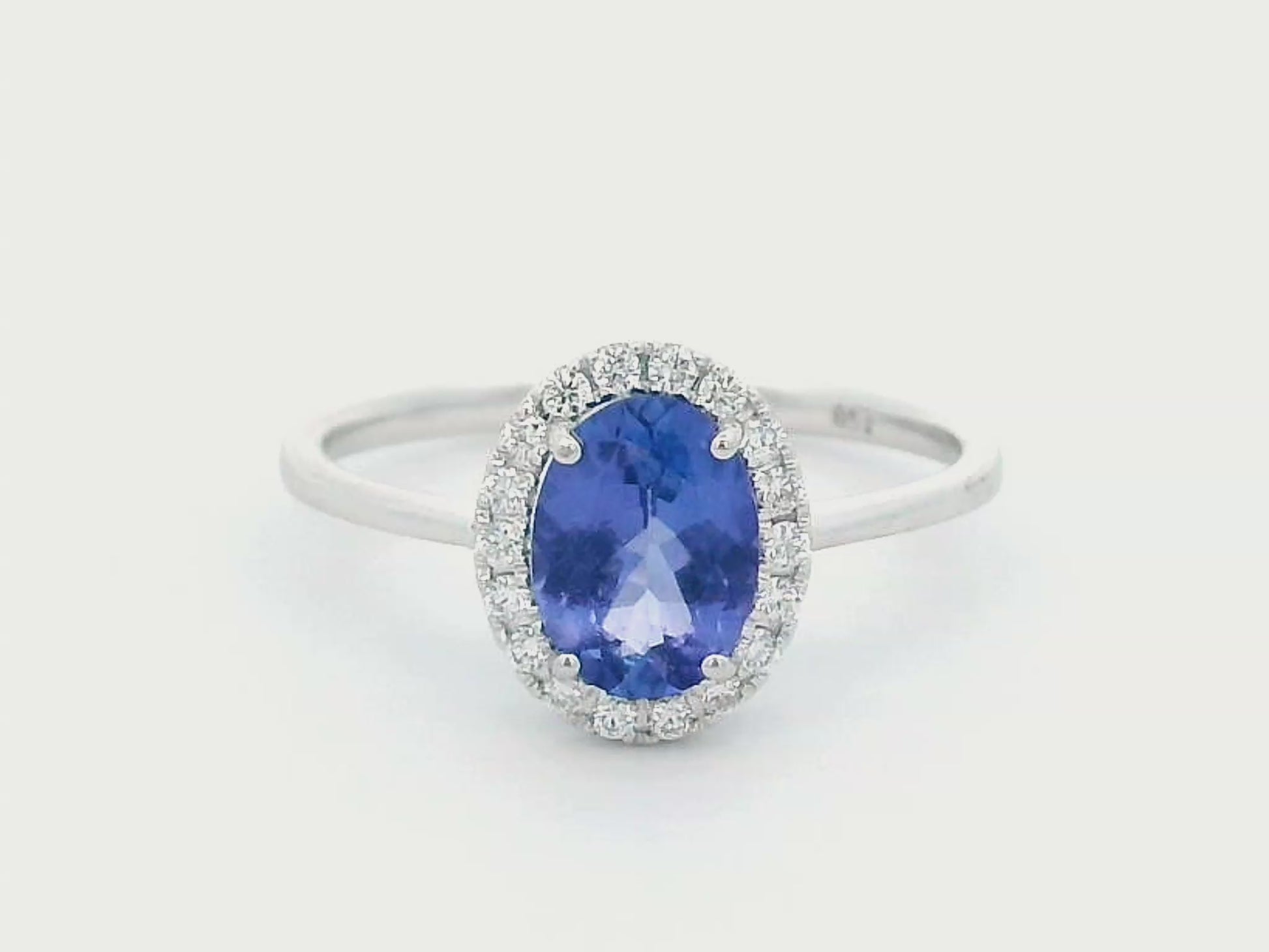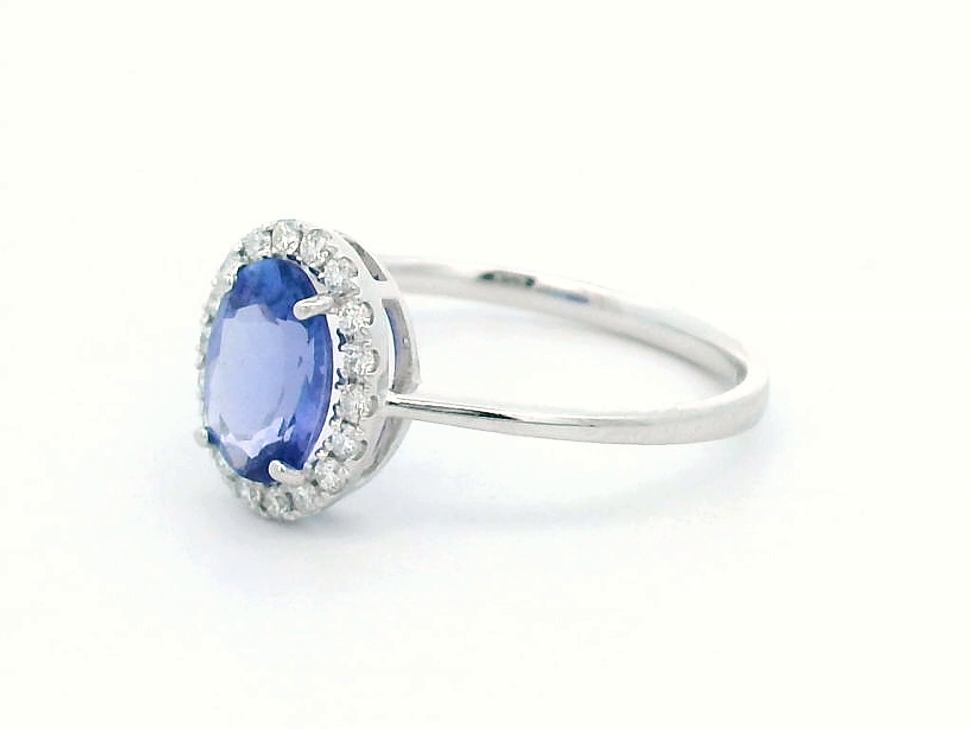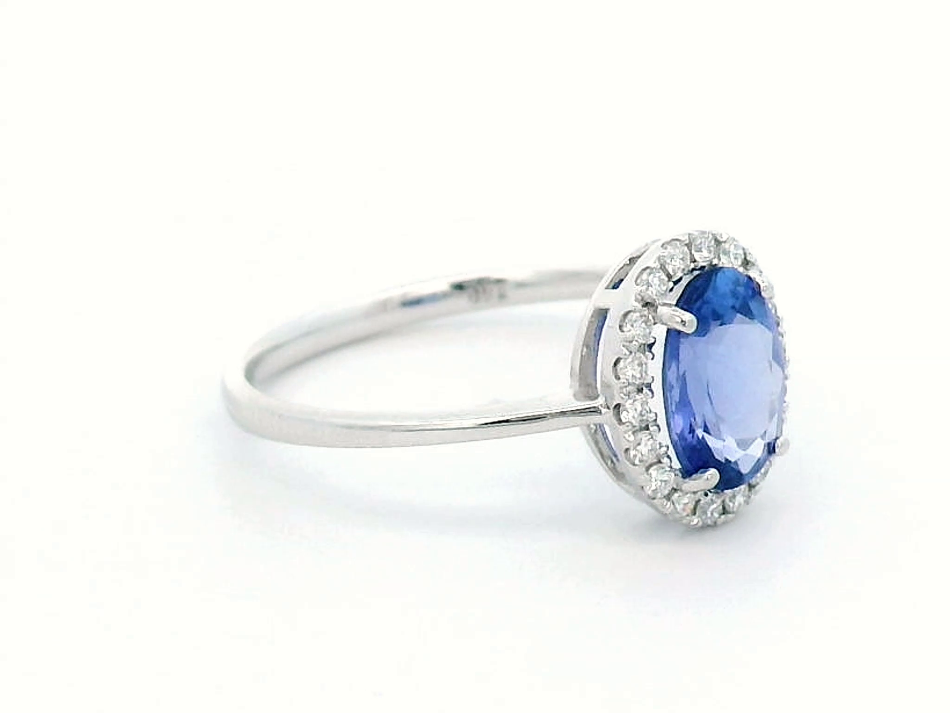 Discover the enchanting beauty of this exquisite 18k gold ring, featuring a captivating 1.26 carat oval-cut tanzanite at its heart. Surrounded by a dazzling halo of 0.15 carat diamonds, this stunning piece gleams with elegance and sophistication. The tanzanite's rich blue-violet tones are beautifully accentuated by the brilliant sparkle of the diamonds, all set against a smooth polished white gold band. Perfect for elevating any occasion, this ring is a true expression of luxury and style, making it an unforgettable addition to your jewelry collection.